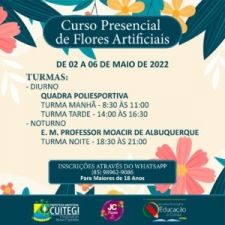 A Prefeitura de Cuitegi, através de parceria entre a Secretaria de Cultura e a JC Flores, irá promover gratuitamente o Curso de Flores Artificias, com início no próximo dia 02 de maio.