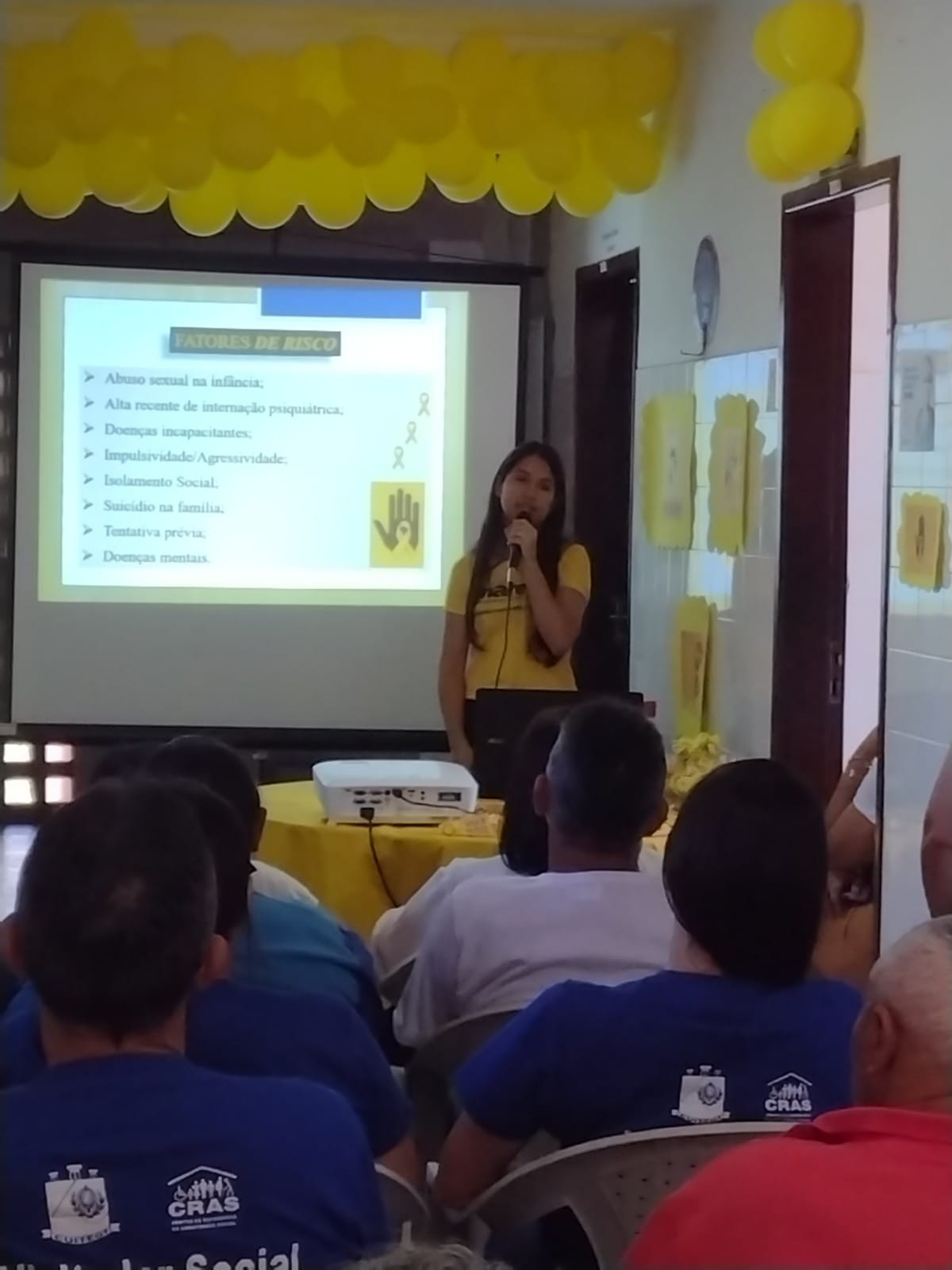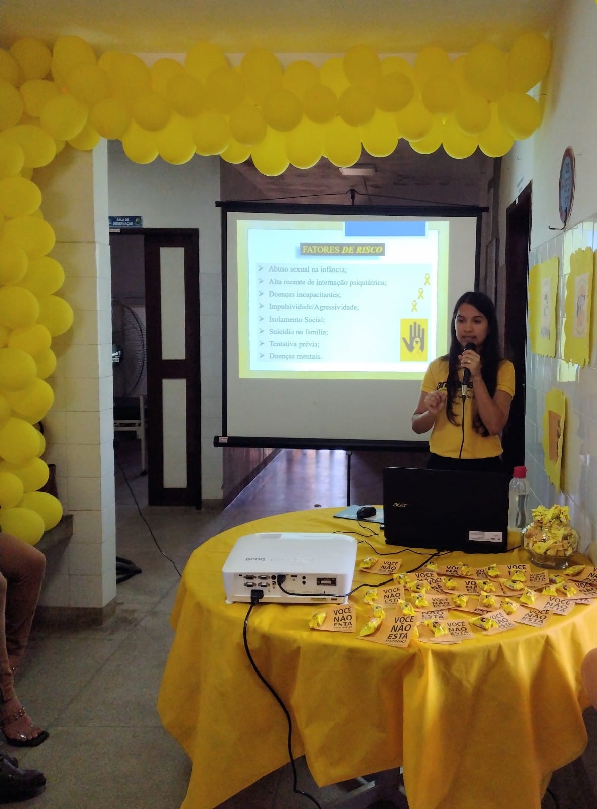 A equipe do Posto de Saúde I (unidade centro) desenvolveu uma atividade em alusão à campanha Setembro Amarelo, que conscientiza sobre a prevenção ao suicídio. As pessoas presentes assistiram palestras ministradas pelas profissionais da unidade, a assistente social Mayra Hellen e a psicóloga Josenícia.