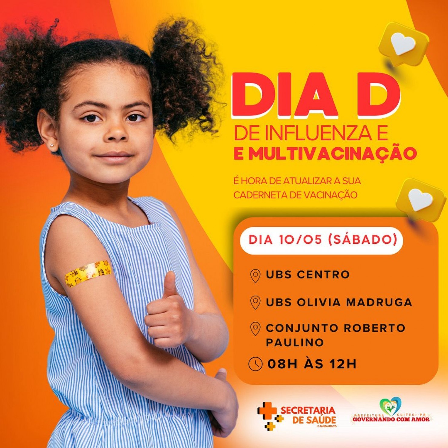 Dia D de Vacinação chegou! Proteja-se contra a influenza e atualize sua caderneta de vacinação. Compareça neste sábado (10/05), das 08h às 12h, nos pontos UBS Centro, UBS Olivia Madruga e Conjunto Roberto Paulino. Vacinar é um ato de amor e cuidado!