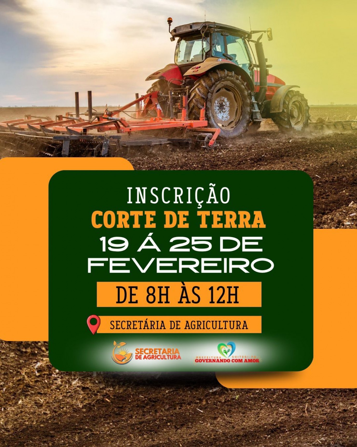 A Prefeitura, por meio da Secretaria de Agricultura, informa que estarão abertas, de 19 a 25 de fevereiro, as inscrições para o Programa de Corte de Terra no município. Os agricultores interessados deverão comparecer à Secretaria de Agricultura, no horário das 8h às 12h, para realizar o cadastro e garantir participação no programa, que tem como objetivo preparar o solo para o plantio, fortalecendo a produção rural e apoiando o homem e a mulher do campo. A iniciativa reafirma o compromisso da gestão municipal com o desenvolvimento da agricultura local, oferecendo suporte aos produtores e incentivando o aumento da produtividade e da geração de renda. A Secretaria reforça a importância de que os agricultores realizem sua inscrição dentro do prazo estabelecido, garantindo organização e planejamento para atender a todos de forma eficiente.
